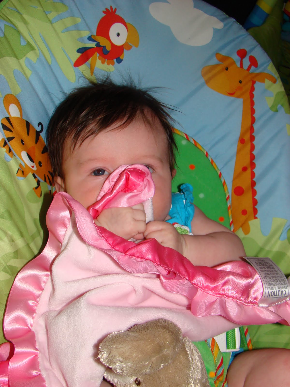 Audrey has discovered how to put things in her mouth. She loves to chew/suck on stuff, mainly cloth. If she is wearing a dress then she is pulling it up and putting it in her mouth. The same goes for burp cloths. But....she already has a favorite toy. She loves this little blankie and sucking on it.